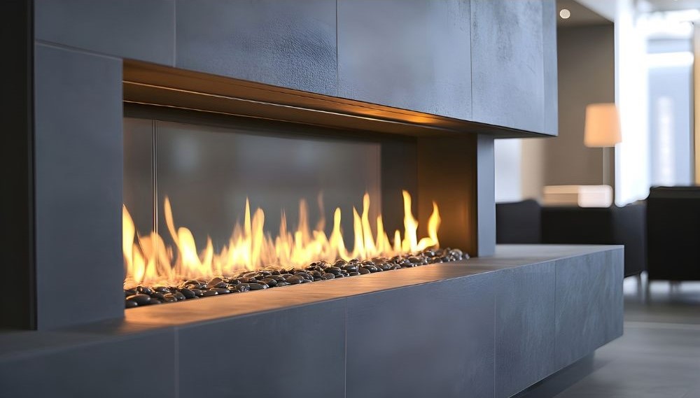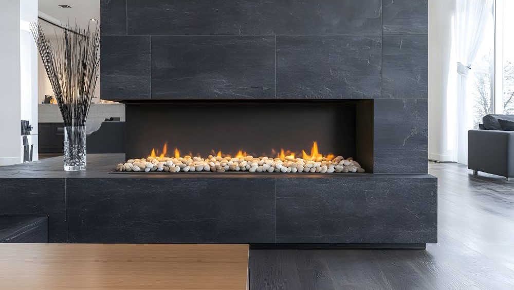 - Realističen plamen in eleganten dizajn – sodobni plinski kamini imajo keramična polena ali dekorativne kamne, ki ustvarjajo naraven videz plamena.
