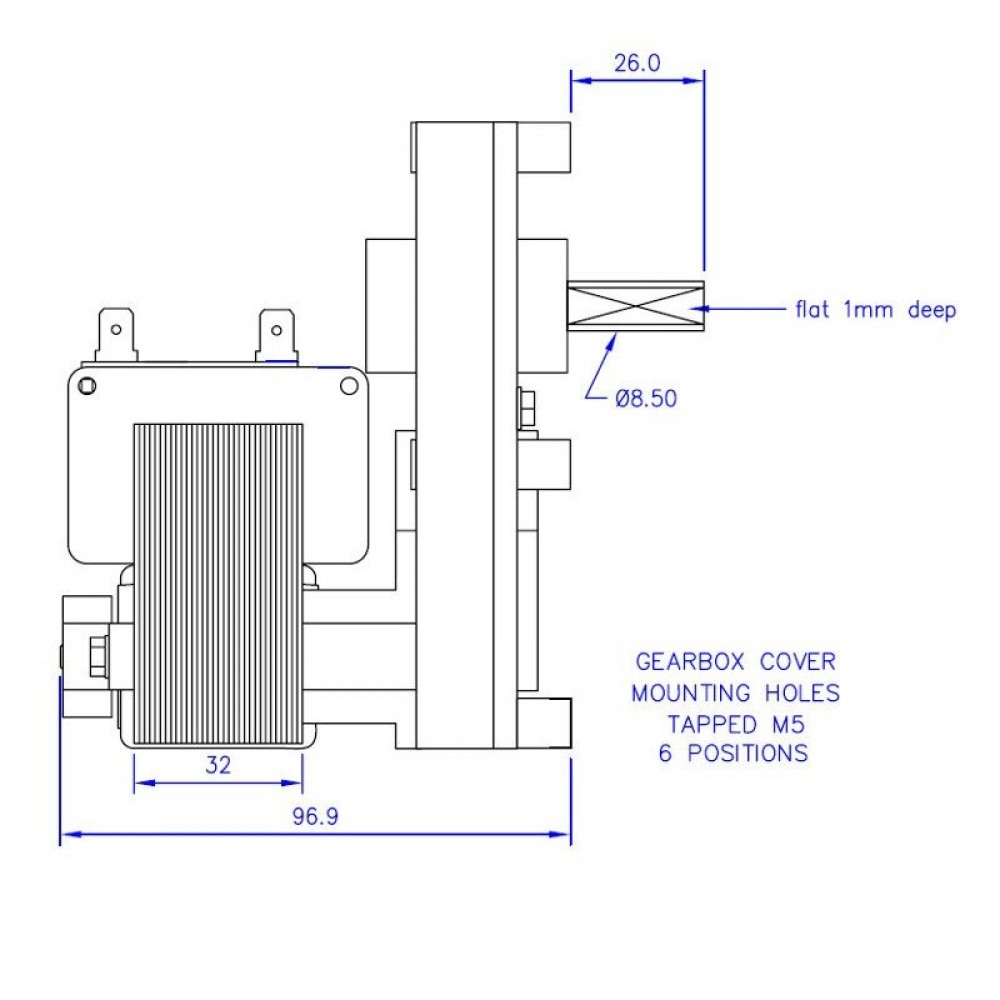 Serija T3, izhodni navor 25 Nm, poraba 28 W, hitrost 3 vrt/min, vrtenje v smeri urinega kazalca, premer gredi 8,5 mm, magnetno jedro 32 mm, napajanje 220 V AC 50/60 Hz.